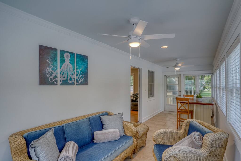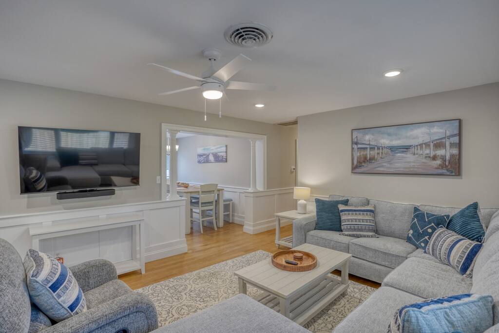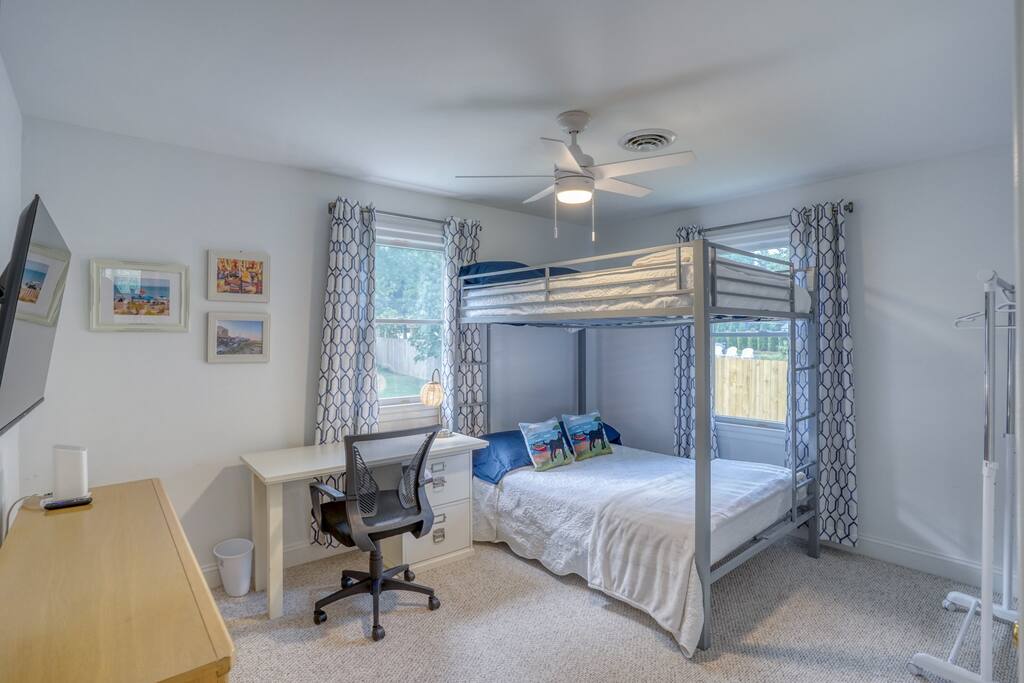 *This property can be rented monthly in the off season (Sept-April) - please submit an inquiry. - Please note - Monthly discounts are not available during the summer season (Memorial Day through Labor Day). **DEL 302 Management standard: -Linens and towels are included -Starter amounts of toilet paper for each bathroom, paper towels, trash bags, dishwasher pods, laundry detergent/pods, hand soap at each sink, and dish soap at the kitchen sink. Also, supply shampoo, conditioner, and body wash in the bathrooms. -Guests are responsible for providing anything they need beyond the starter amounts provided. Bedroom 1: King Bed Bedroom 2: Queen Bed Bedroom 3: Bunk bed - Double over Double Additional Sleeping: Pull out couch in living room - Double Bed OUTDOOR LIVING: Fully fenced back yard with paver patio. INDOOR LIVING: Spacious living room, sunroom, fully equipped Kitchen, Smart TVs w/ streaming services, Dining table, and ceiling fans. KITCHEN: Fully equipped, stainless steel appliances, microwave, coffee maker(Keurig and drip), toaster, dishware/flatware, cooking basics. GENERAL: WiFi, washer/dryer, linens, bath towels, AC/Heat, keyless entry. FAQ: Linens and towels provided, security cameras at front/side/rear entrances, 1 dog allowed with pet fee. PARKING: Driveway - 4 cars - (2 cars on concrete pad, 2 cars on gravel driveway)
