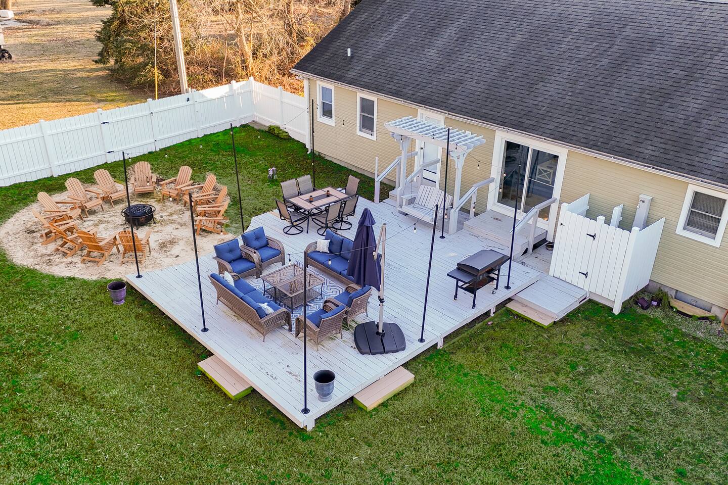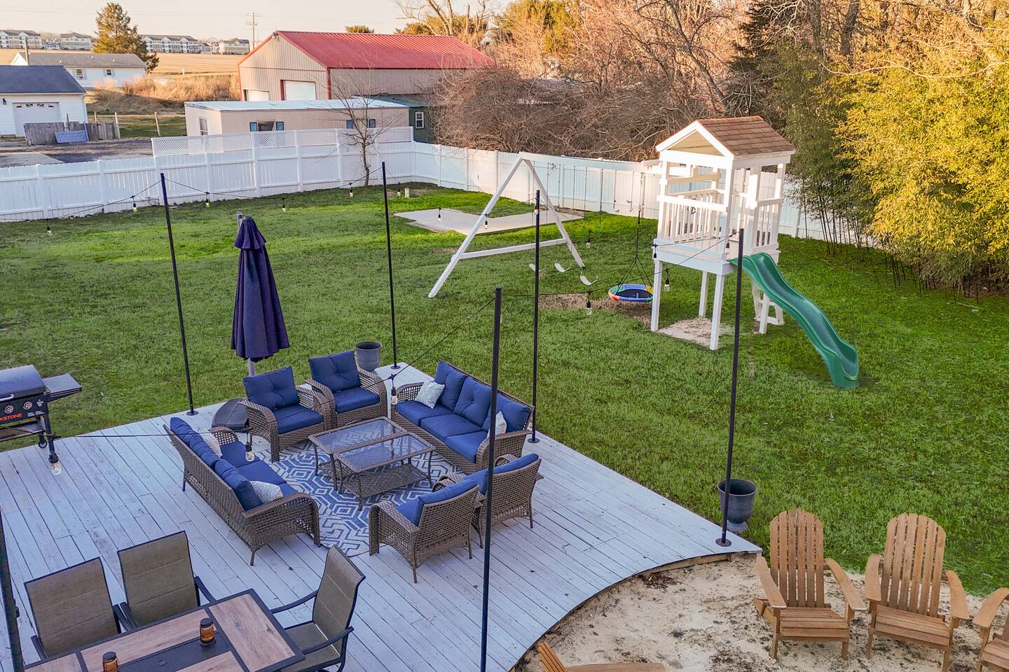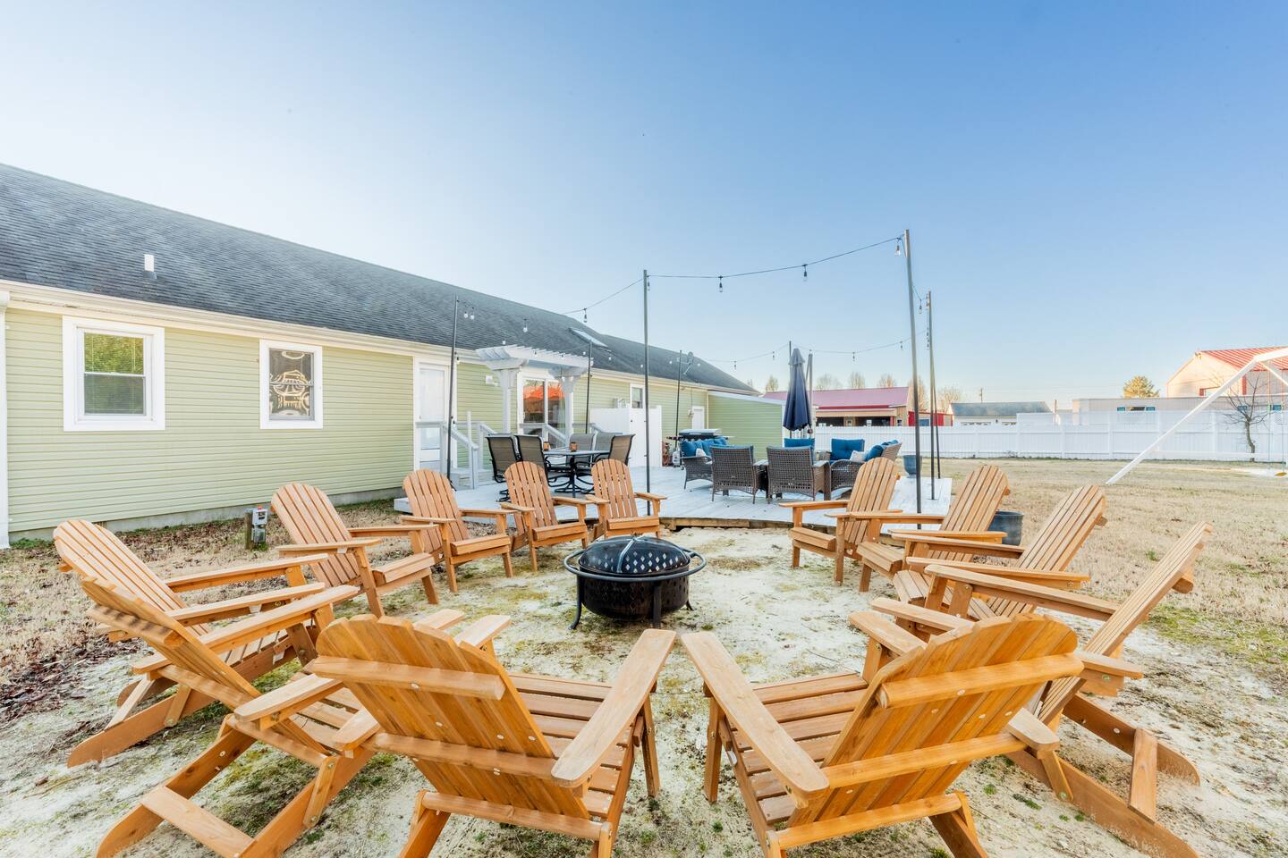 - All guests must be at least 25 years old, except for children with parents. - Please note - Monthly discounts are not available during the summer season (Memorial Day through Labor Day). **DEL 302 Management standard: -Linens and towels are included -Starter amounts of toilet paper for each bathroom, paper towels, trash bags, dishwasher pods, laundry detergent/pods, hand soap at each sink, and dish soap at the kitchen sink. Also, supply shampoo, conditioner, and body wash in the bathrooms. -Guests are responsible for providing anything they need beyond the starter amounts provided. 5BR House: Bedroom 1: King Bed and a Twin bed w/ en suite bathroom Bedroom 2: 2 sets of Twin over Twin bunk beds & 1 Twin Bedroom 3: King bed Bedroom 4: Full bed Bedroom 5: King bed 2BR Unit: Bedroom 1: Queen Bed w/ en suite bathroom - 1st Floor Bedroom 2: King Bed w/ en suite bathroom - 2nd floor *Please note for this 2BR unit: 1st Floor - has AC/Heat mini split in Kitchen 2nd Floor - has window AC unit & baseboard heat OUTDOOR LIVING: - Fully fenced in outdoor privated yard with string lights - Outdoor shower - Blackstone gas grill - Fire pit with 12 adirondack chairs - Outdoor dining table - Outdoor lounge area on deck - Outdoor playset with swings INDOOR LIVING: Spacious living room with fireplace, fully equipped Kitchen with kitchen island, Smart TVs w/ streaming services, Dining table. KITCHEN: Fully equipped, stainless steel appliances, microwave, Keurig coffee pot, toaster, dishware/flatware, cooking basics. GENERAL: WiFi, washer/dryer, linens, bath towels, hairdryer, central AC/Heat, keyless entry, coffee maker, pots/pans, iron and ironing board. PARKING: -Plenty of parking in the front gravel driveway for up to 6 cars. *Note - grass cutting occurs every Tuesday in season. (could get pushed to Wednesday due to bad weather or holiday) *Dogs welcome w/ $200 pet fee (2 dogs max, no cats) Designed to be your perfect location for multi-generational family reunions or other large groups, you have easy access to 7 beaches within 13-27 minutes, single-level living, and a fantastic patio and sprawling private fenced backyard for playtime with kids, family, friends, and even pups. Imagine being at the beach by day and in the twinkly backyard by night to squeeze enjoyment out of every minute of your vacation. That’s why we call it Coastal Quarters – your headquarters for fun at the Delaware beaches. PROXIMITY: 1.9 miles to Shell We Bounce Trampoline Park 2.6 miles to Atracare - Urgent care/walk-in 2.7 miles to Georgetown-Lewes Trailhead entrance 2.8 miles to Lefty's Alley & Eats bowling alley/restaurant 2.8 miles to Cape Wine & Spirits 3.4 miles to Nassau Valley Vineyards-Winery 3.9 miles to Tanger Outlets (Surfside) 4.3 miles to Beebe Walk-in Rehoboth 5.6 miles to Lewes Beach 6.3 miles to Jungle Jims Waterpark 6.5 miles to Cape Henlopen State Park 7.8 miles to Rehoboth Beach & Boardwalk 8.5 miles to Dewey Beach 13 miles to Broadkill Beach 16 miles to Prime Hook Beach 19 miles to Slaughter Beach 19 miles to Bethany Beach and Boardwalk