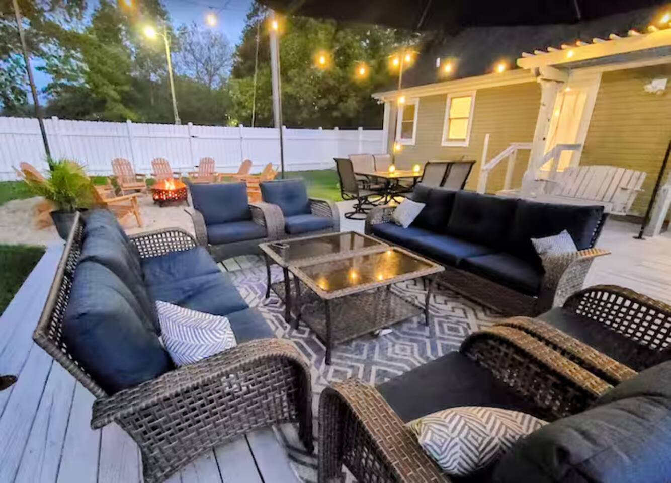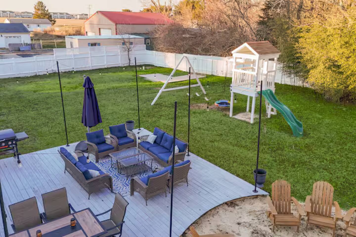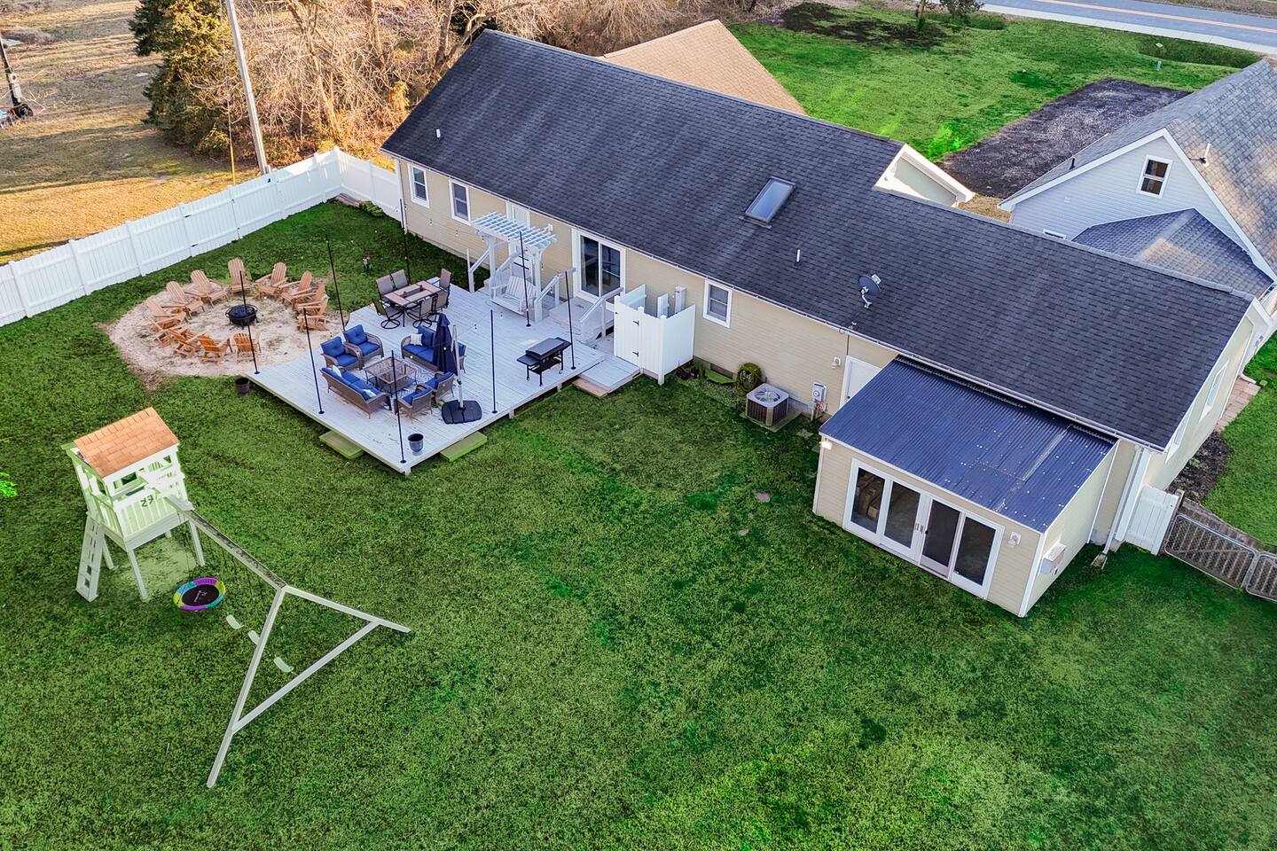 - All guests must be at least 25 years old, except for children with parents. - Please note - Monthly discounts are not available during the summer season (Memorial Day through Labor Day). **DEL 302 Management standard: -Linens and towels are included -Starter amounts of toilet paper for each bathroom, paper towels, trash bags, dishwasher pods, laundry detergent/pods, hand soap at each sink, and dish soap at the kitchen sink. Also, supply shampoo, conditioner, and body wash in the bathrooms. -Guests are responsible for providing anything they need beyond the starter amounts provided. 5BR House: Bedroom 1: King Bed and a Twin bed w/ en suite bathroom Bedroom 2: 2 sets of Twin over Twin bunk beds & 1 Twin Bedroom 3: King bed Bedroom 4: Full bed Bedroom 5: King bed 2BR Unit: Bedroom 1: Queen Bed w/ en suite bathroom - 1st Floor Bedroom 2: King Bed w/ en suite bathroom - 2nd floor *Please note for this 2BR unit: 1st Floor - has AC/Heat mini split in Kitchen 2nd Floor - has window AC unit & baseboard heat OUTDOOR LIVING: - Fully fenced in outdoor privated yard with string lights - Outdoor shower - Blackstone gas grill - Fire pit with 12 adirondack chairs - Outdoor dining table - Outdoor lounge area on deck - Outdoor playset with swings INDOOR LIVING: Spacious living room with fireplace, fully equipped Kitchen with kitchen island, Smart TVs w/ streaming services, Dining table. KITCHEN: Fully equipped, stainless steel appliances, microwave, Keurig coffee pot, toaster, dishware/flatware, cooking basics. GENERAL: WiFi, washer/dryer, linens, bath towels, hairdryer, central AC/Heat, keyless entry, coffee maker, pots/pans, iron and ironing board. PARKING: -Plenty of parking in the front gravel driveway for up to 6 cars. *Note - grass cutting occurs every Tuesday in season. (could get pushed to Wednesday due to bad weather or holiday) *Dogs welcome w/ $200 pet fee (2 dogs max, no cats) Designed to be your perfect location for multi-generational family reunions or other large groups, you have easy access to 7 beaches within 13-27 minutes, single-level living, and a fantastic patio and sprawling private fenced backyard for playtime with kids, family, friends, and even pups. Imagine being at the beach by day and in the twinkly backyard by night to squeeze enjoyment out of every minute of your vacation. That’s why we call it Coastal Quarters – your headquarters for fun at the Delaware beaches. PROXIMITY: 1.9 miles to Shell We Bounce Trampoline Park 2.6 miles to Atracare - Urgent care/walk-in 2.7 miles to Georgetown-Lewes Trailhead entrance 2.8 miles to Lefty's Alley & Eats bowling alley/restaurant 2.8 miles to Cape Wine & Spirits 3.4 miles to Nassau Valley Vineyards-Winery 3.9 miles to Tanger Outlets (Surfside) 4.3 miles to Beebe Walk-in Rehoboth 5.6 miles to Lewes Beach 6.3 miles to Jungle Jims Waterpark 6.5 miles to Cape Henlopen State Park 7.8 miles to Rehoboth Beach & Boardwalk 8.5 miles to Dewey Beach 13 miles to Broadkill Beach 16 miles to Prime Hook Beach 19 miles to Slaughter Beach 19 miles to Bethany Beach and Boardwalk